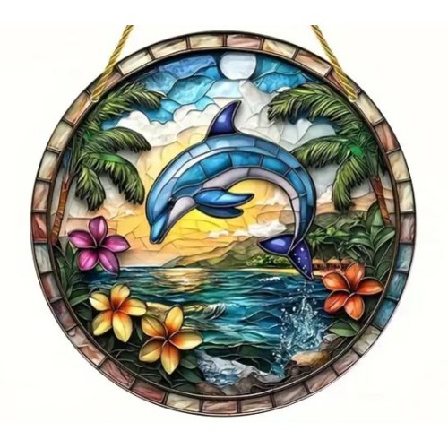 8"x8" acrylic suncatcher features a sweet dolphin in the middle of a tropical paradise.