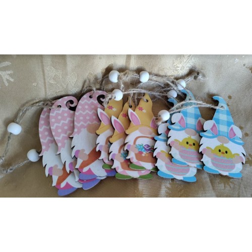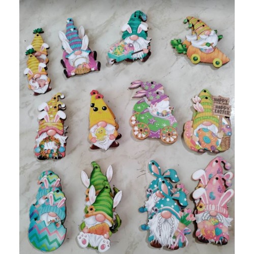 Assorted Easter Gnome Ornaments (wooden). Each order will be randomly selected from 15 different varieties.